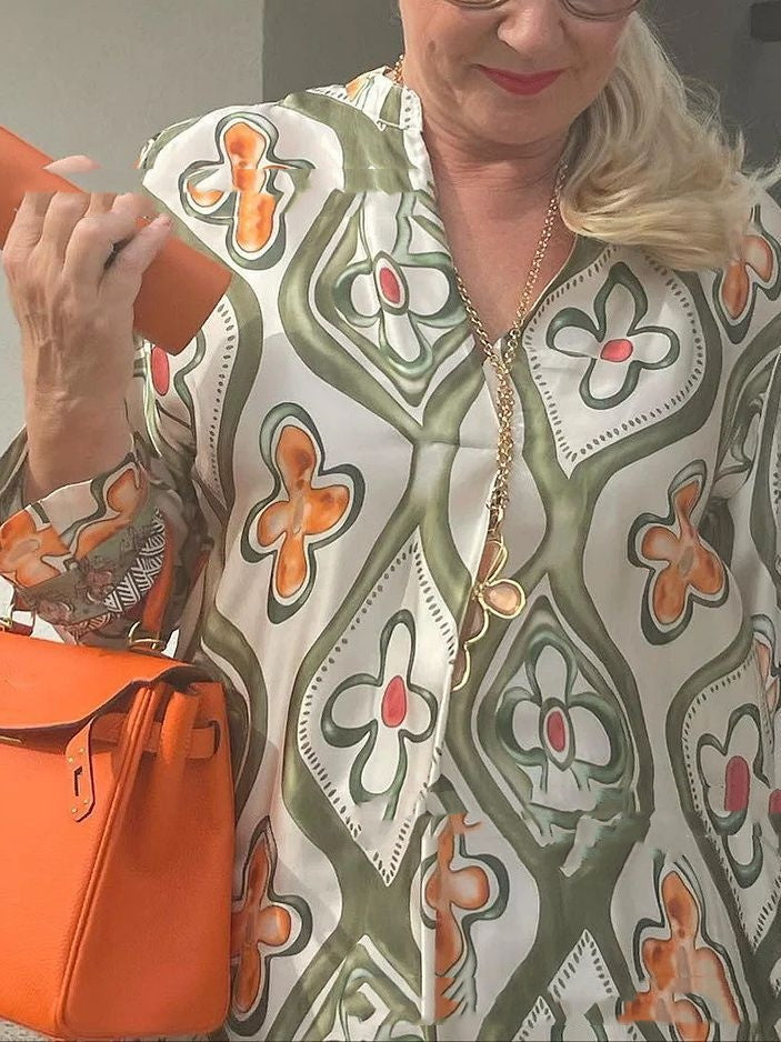 Fashionable V-neck Printed Loose Dress Long Dress