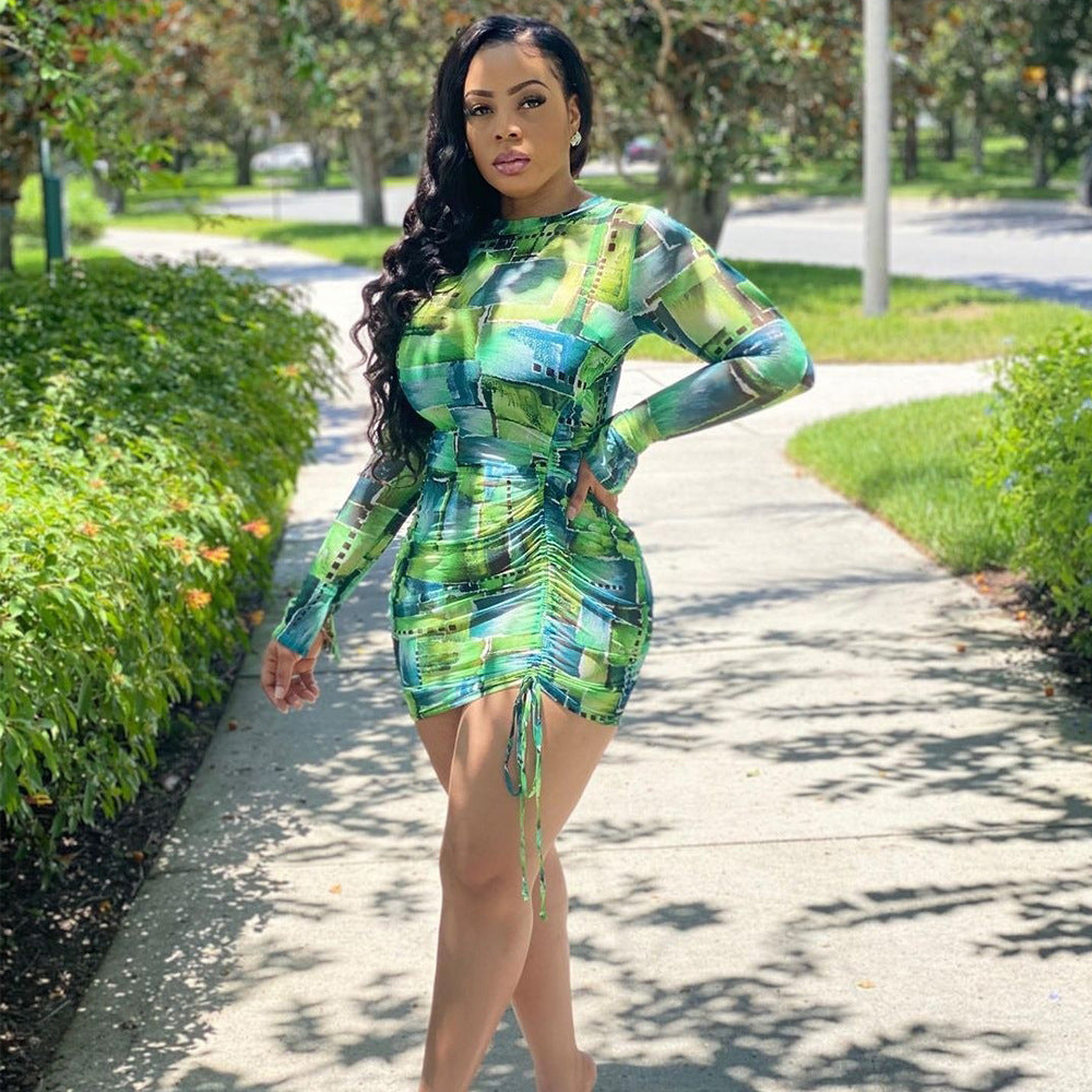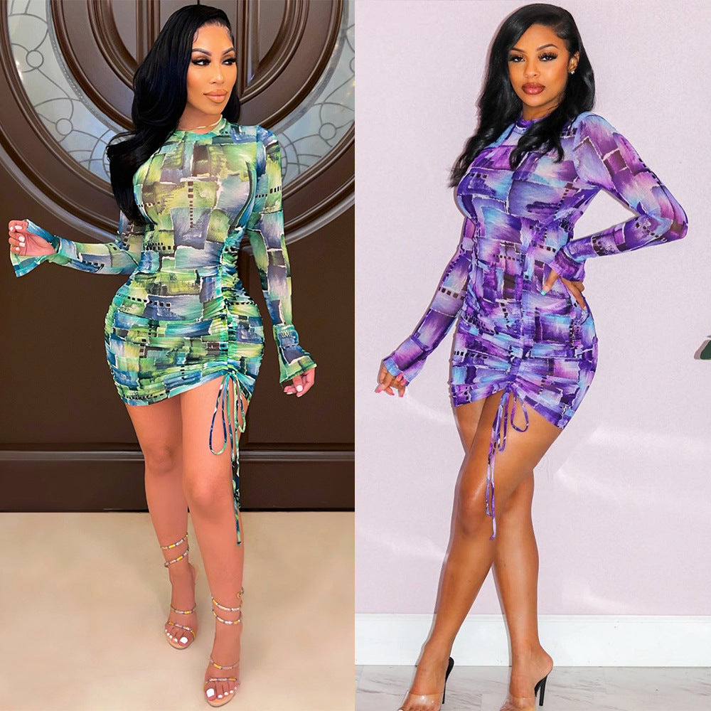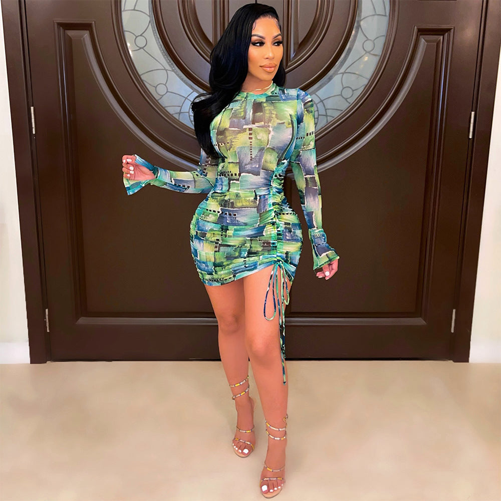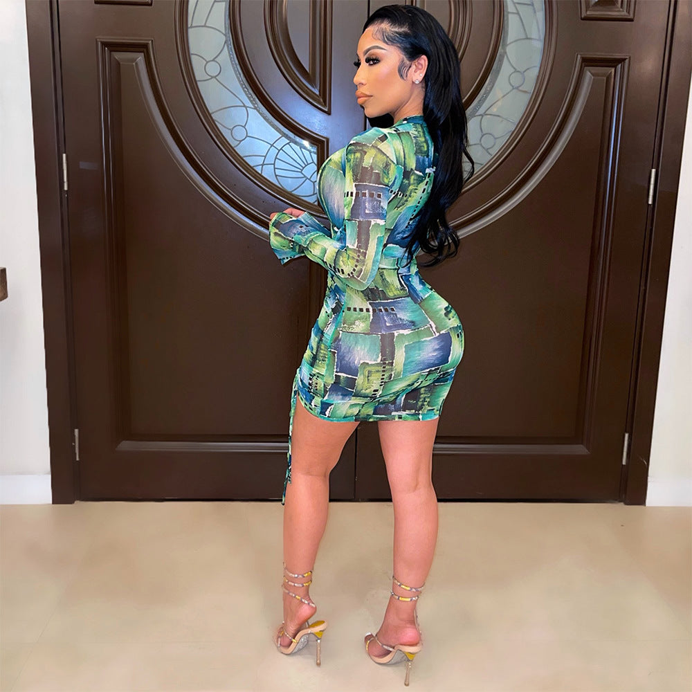 Net Yarn See-Through Print Pleated Long-Sleeved Ladies Dress
