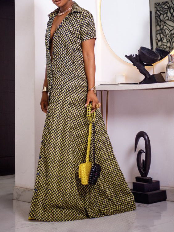 Plus Size Loose Lapels Button Short Sleeve Plus Size Printed Shirt Dress